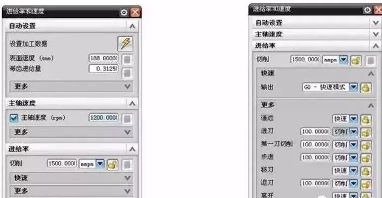 进给率和速度用于设置主轴转速与进给,弹出进给对话框,可以展开进给率的“更多”选项显示不同运动状态的进给设置