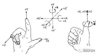 2.坐标系采用右手直角笛卡尔坐标系。如图1-1所示大拇指的方向为X轴的正方向,食指指向为Y轴的正方向,中指指向为Z轴的正方向。在确定了X、Y、Z坐标的基础上,根据右手螺旋法则,可以很方便地确定出A、B、C三个旋转坐标的方向。